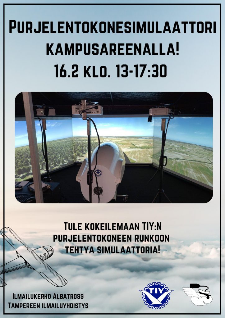 Maanantaina 19.2 noin klo 11-17 pääsee kokeilemaan Tampereen ilmailuyhdistyksen aidon purjelentokoneen runkoon tehtyä simulaattoria kampusareenan 1. kerroksen aulassa! Kannattaa tulla kokeilemaan!