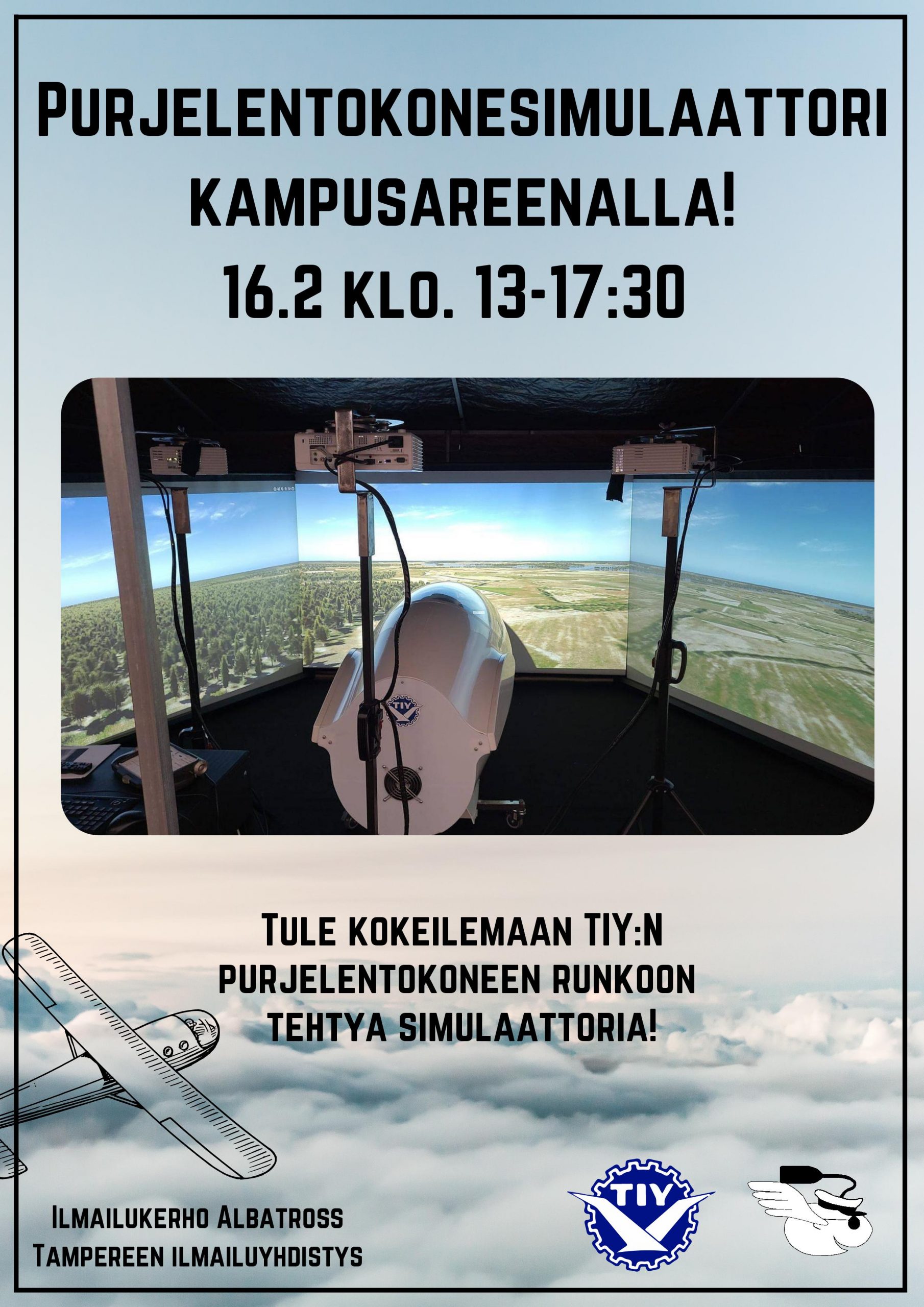 Torstaina 16.2 noin klo 13-17.30 pääsee kokeilemaan Tampereen ilmailuyhdistyksen aidon purjelentokoneen runkoon tehtyä simulaattoria kampusareenan 1. kerroksen aulassa! Kannattaa tulla kokeilemaan!